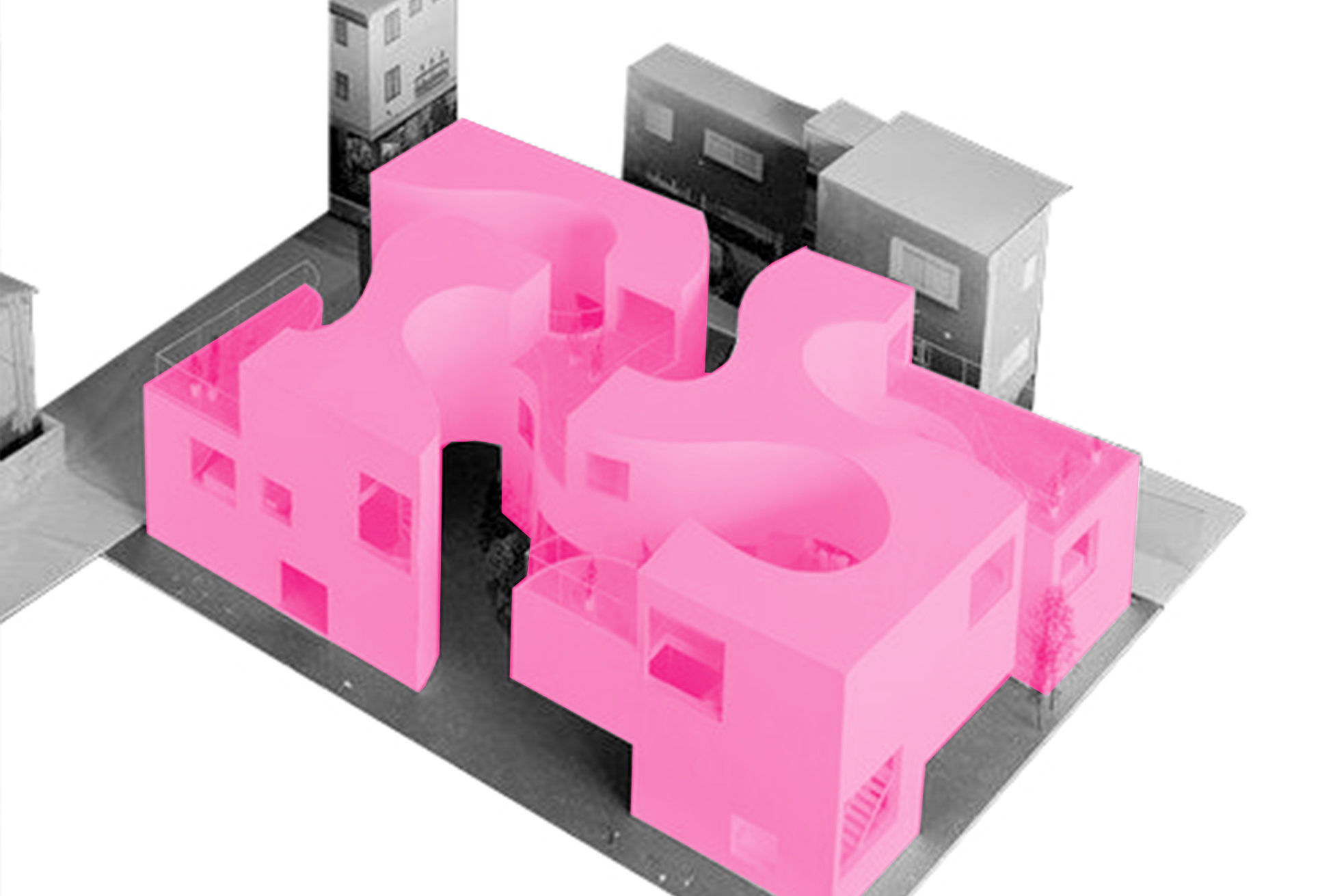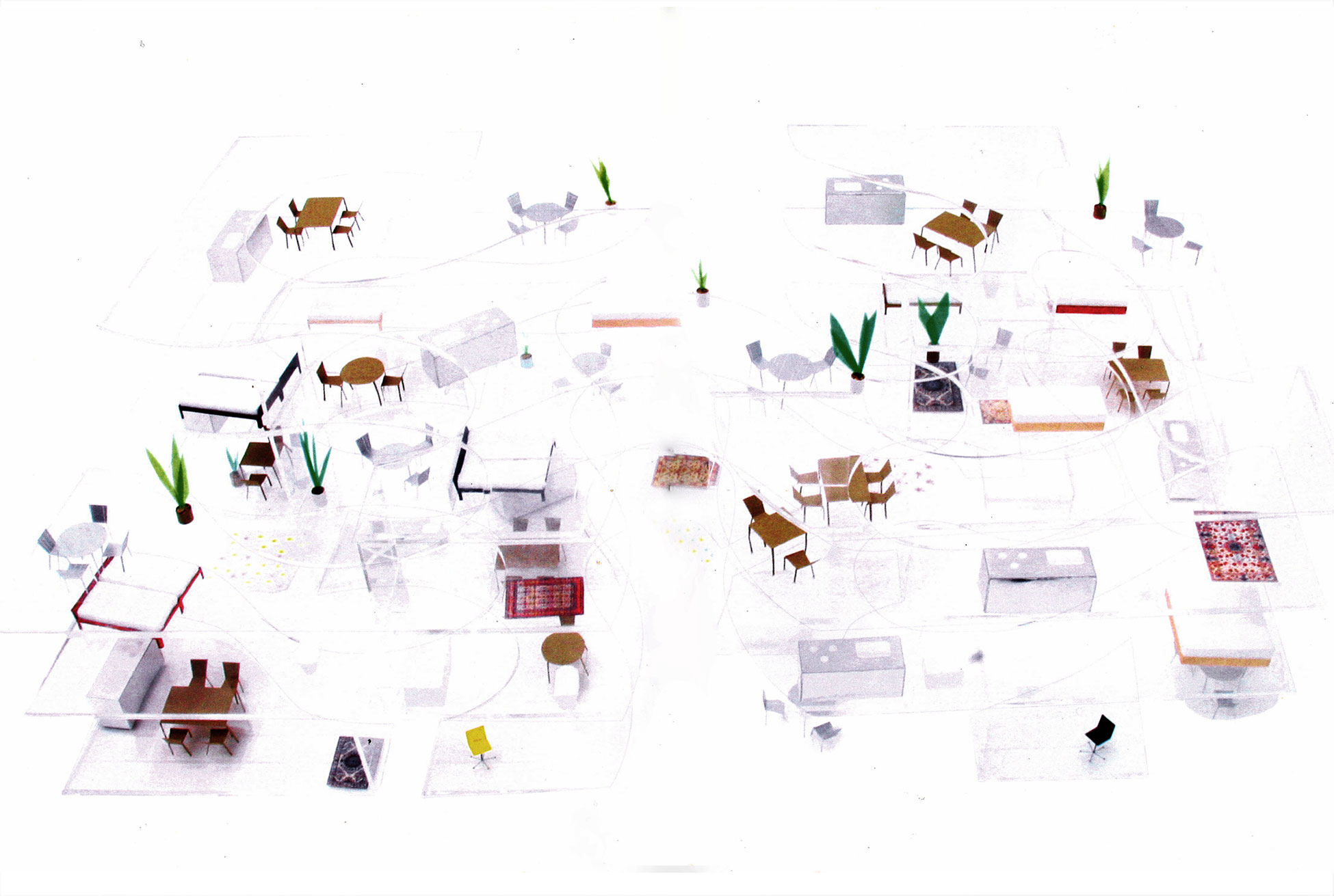 La estrategia proyectual del campo de objetos se aplica a escala arquitectónica en otros proyectos del estudio SANAA. En la maqueta de los apartamentos Okurayama puede verse como la aparentemente aleatoria disposición del mobiliario, que en este caso es lo mismo que decir la organización de las funciones, genera a su alrededor un “campo” que la envolvente se encarga de materializar. Para enfatizar el carácter contingente de la disposición, los autores juegan deliberadamente con la disparidad entre los muebles. El espacio interior de los apartamentos es la solidificación de este “campo de objetos” basado en el mobiliario.